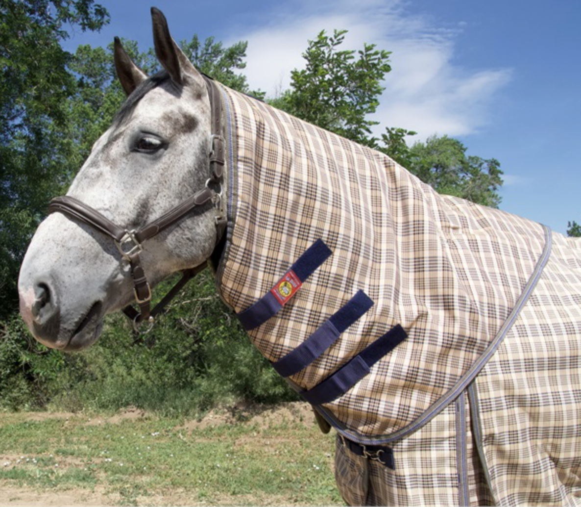 Three Velcro® straps on the neck let you quickly snug the cover down. A fourth strap, at the top of the neck, can be attached to the bridle, keeping the protector firmly in place.