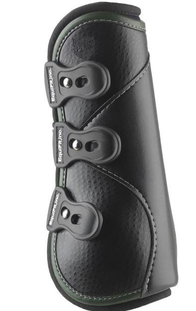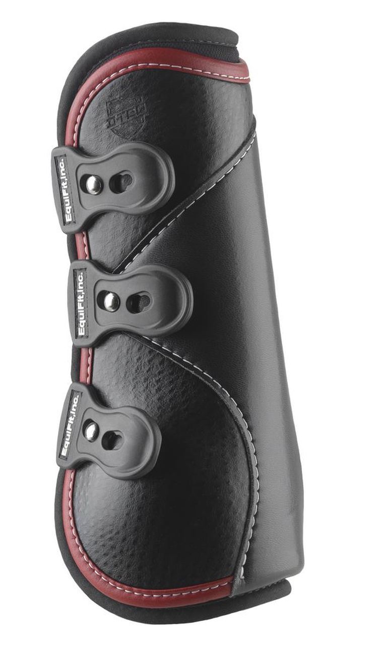 EquiFit D-Teq Front Boots with Color Binding give your horse ImpacTeq liner protection and personal color style choices! Your favorite open front jump boots are here in Black with Black Ostrich panels and your choice of Red, Navy, Green, or Brown edge binding. Choose the color to match your saddle pad, your barn colors, or whatever looks best on your beautiful horse! EquiFit D-Teq Open Front Boots have a strong, durable Everleather outer shell that resists impact and is anatomically molded for maximum freedom of movement, The inner ImpacTeq liner dissipates shock and energy to protect vulnerable legs. The material firms instantly upon impact to protect the leg then softens again. Your horse gets superior protection and style with the EquiFit D-Teq Color Binding Boots!