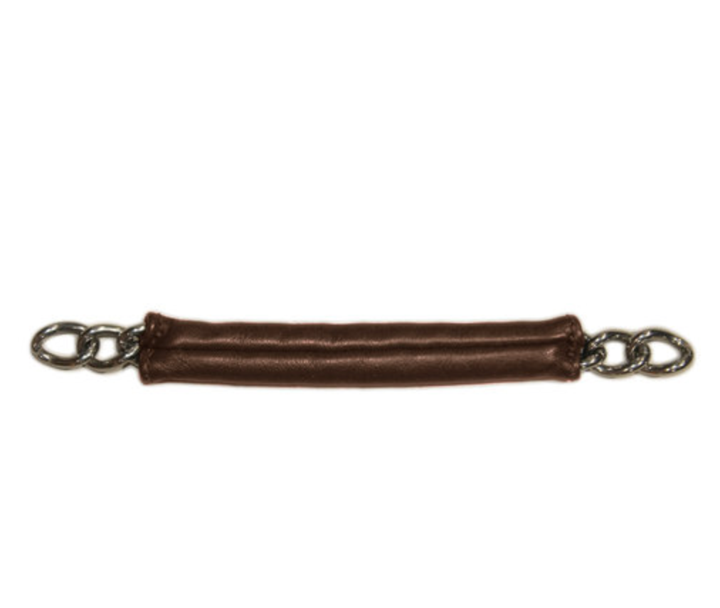 Leather Covered Curb Chain is tailor-made for sensitive horses that go well in a Pelham, but would benefit from a softer touch. The leather also muffles the noise of the curb chain itself. A standard stainless steel curb chain is fully-covered in very soft and supple smooth chap leather.